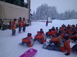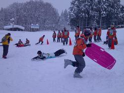 スキー講習後は、雪上レクで「ソリレー」を行いました。