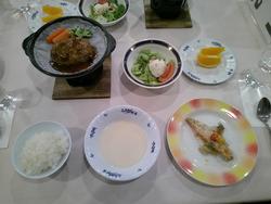 夕食は、ハンバーグ、サーモンパン粉焼き、ポテトサラダ、コーンスープ、くだもの、ごはんでした。