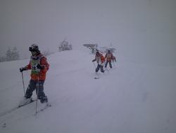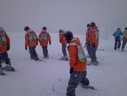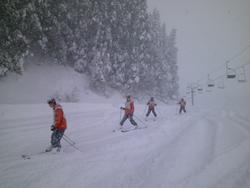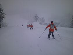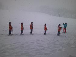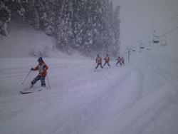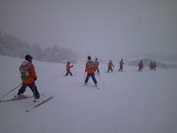 午前の講習が9:00から始まり、すぐにリフトに乗って山の上から講習しています。