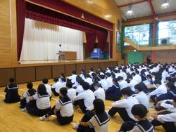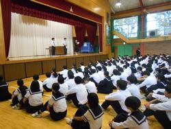 生徒朝会が行われました。朝会の前に先日行われた新人体育大会の表彰を行いました。男女卓球部と剣道部が表彰されました。