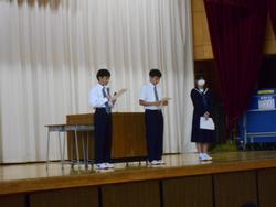 生徒朝会の内容は、生徒会役員からの生徒会の紹介がありました。生徒会役員として公約を達成するために仲間と共に試行錯誤しながら生徒会を運営できた達成感や成就感についての話がありました。整美委員会より整美コンクールの成績発表がありました。学校がいつもきれいに保たれているのは整美委員会の取組の成果であると言えます。今後もよろしくお願いします。